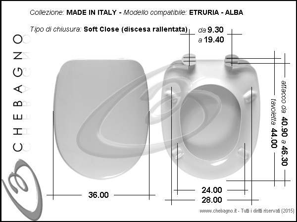 Alba Etruria Sedile wc bianco in termoindurente, chiusura rallentata (soft close), cerniere in metallo regolabili. Copriwater compreso di cerniere e paracolpi.