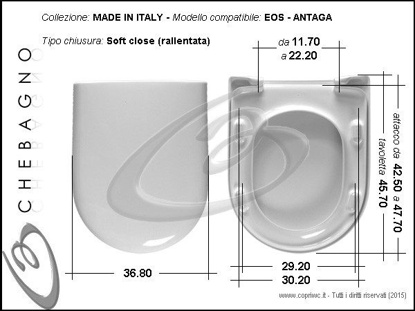 Dotazione copriwater: Coperchio avvolgente con copertura totale della ciambella in posizione di chiusura, kit di fissaggio slow close in metallo regolabile, avvitabile dall'alto e dal basso, paracolpi.