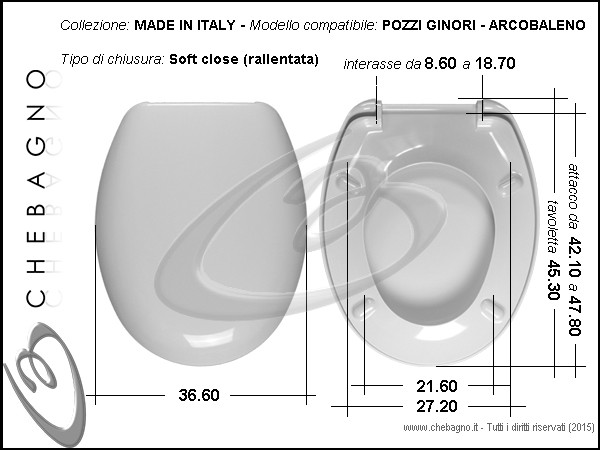 Arcobaleno Pozzi Ginori Sedile wc bianco in termoindurente avvolgente, chiusura rallentata (soft close), cerniere avvitabili dall'alto e dal basso. Copriwater compreso di cerniere e paracolpi.