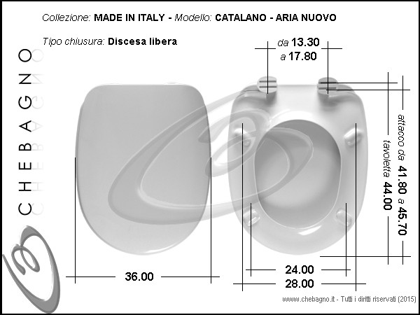 Aria Nuovo Catalano Sedile wc bianco in termoindurente e cerniere avvitabile dal basso. Copriwater compreso di cerniere e paracolpi.