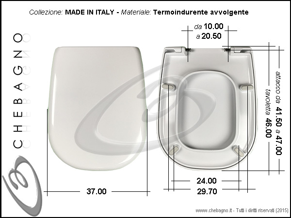 Dotazione copriwater: Coperchio avvolgente con copertura totale della ciambella in posizione di chiusura, kit di fissaggio in metallo regolabile, avvitabile dal basso e dall'alto (alta resistenza), paracolpi.