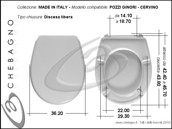 Cervino Pozzi Ginori Sedile wc bianco in termoindurente e cerniere avvitabile dal basso. Copriwater compreso di cerniere e paracolpi.