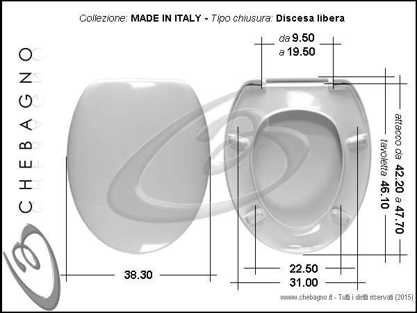 Dotazione copriwater: Coperchio avvolgente con copertura totale della ciambella in posizione di chiusura, kit di fissaggio in acciaio inox regolabile, avvitabile dall'alto e dal basso (alta resistenza), paracolpi.