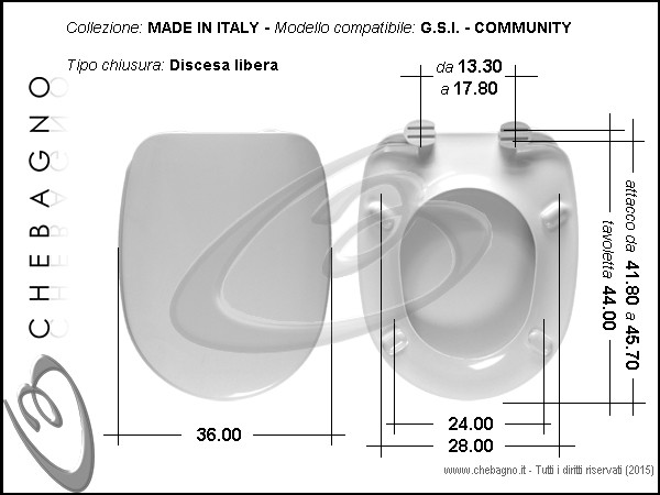 Community Gsi Sedile wc bianco in termoindurente e cerniere avvitabile dal basso. Copriwater compreso di cerniere e paracolpi.