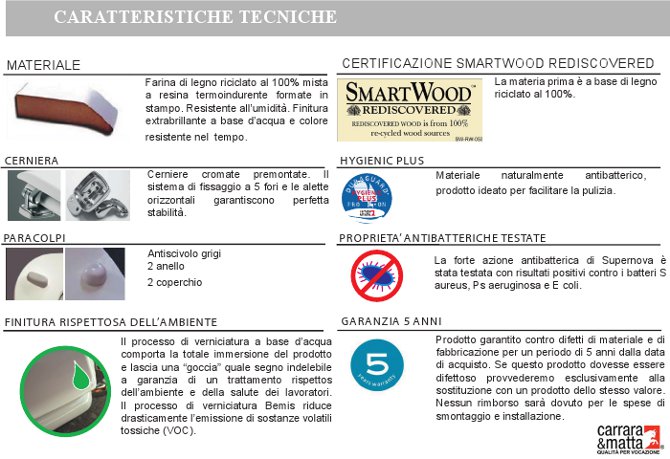 Materiale: Farina di legno e resina termoindurente. Copriwater prodotto in stampo. Certificato SmartWood Rediscovered, ossia utilizzo 100% legno riciclato e utilizzo di vernice a base d'acqua che consente una forte riduzione di VOC nell'ambiente.