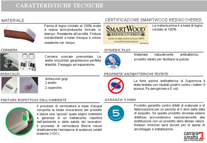 Materiale: Farina di legno e resina termoindurente. Copriwater prodotto in stampo. Certificato SmartWood Rediscovered, ossia utilizzo 100% legno riciclato e utilizzo di vernice a base d'acqua che consente una forte riduzione di VOC nell'ambiente.