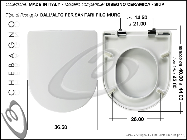 Copriwater DISEGNO CERAMICA SKIP. Sedile wc bianco in termoindurente avvolgente, chiusura libera, cerniere in metallo. Copriwater compreso di cerniere e paracolpi.
