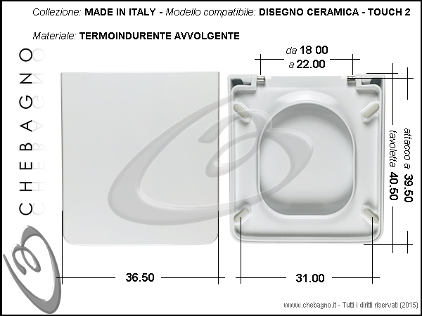 Copriwater DISEGNO CERAMICA TOUCH 2. Sedile wc bianco in termoindurente avvolgente, chiusura libera o soft-close, cerniere in metallo. Copriwater compreso di cerniere e paracolpi.