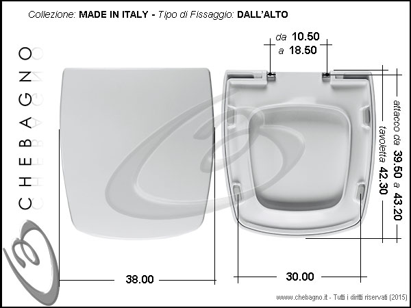 Dotazione copriwater: Coperchio avvolgente con copertura totale della ciambella in posizione di chiusura, kit di fissaggio in metallo regolabile, avvitabile dal basso e dall'alto (alta resistenza), paracolpi.