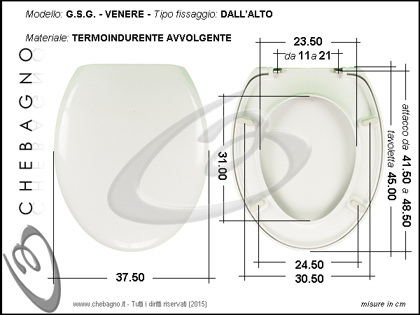 Copriwater GSG VENERE. Sedile wc bianco in termoindurente avvolgente, chiusura libera o soft-close, cerniere in acciaio. Copriwater compreso di cerniere e paracolpi.