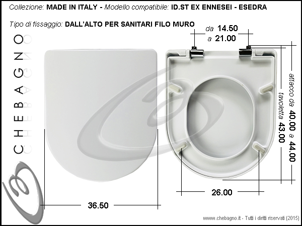 Copriwater ID.ST ENNESEI ESEDRA. Sedile wc bianco in termoindurente avvolgente, chiusura libera, cerniere in metallo. Copriwater compreso di cerniere e paracolpi.