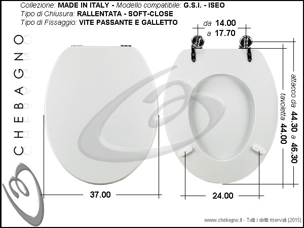 COPRIWATER ISEO GSI CHIUSURA RALLENTATA - SOFT-CLOSE - Disponibile in 63 Colori + Essenze in Legno + Made in Italy. Qualità TOP. Copriwater compreso di cerniere e paracolpi.