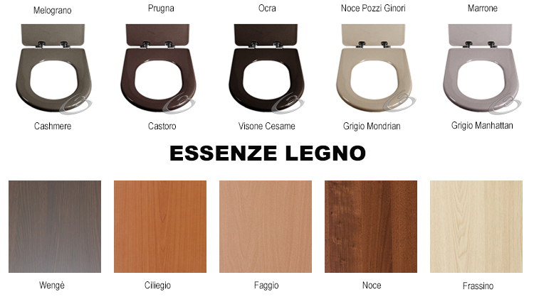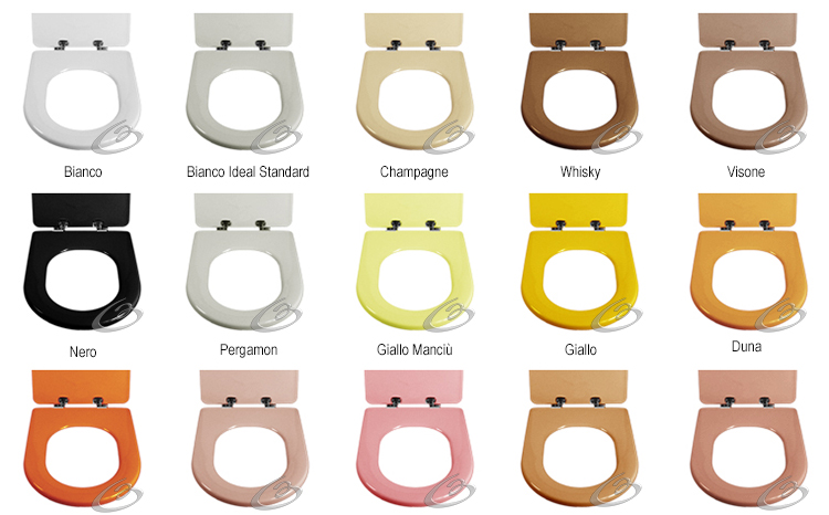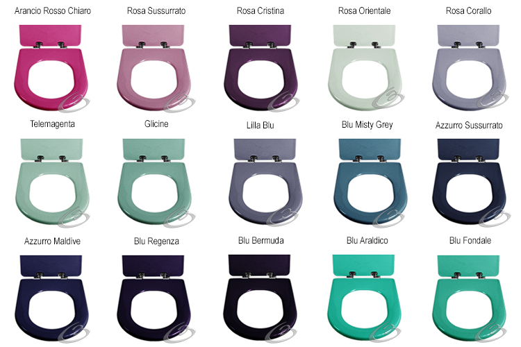 Colori disponibili copriwater: Bianco, Bianco Ideal Standard, Arancio brillante, Arancio rosso chiaro, Pergamon, Giallo Manciù, Giallo, Duna, Rosa sussurrato, Rosa Cristina, Rosa Orientale, Rosa corallo, Telemagenta, Glicine, Lilla Blu, Blu Misty Grey, Azzurro sussurrato, Azzurro Maldive, Blu Regenza, Blu Bermuda, Blu Araldico, Blu Fondale, Blu Mare, Zaffiro, Mirtillo, Turchese, Calypso, Verde Scogliera, Verde sussurrato, Verde Pozzi Ginori, Verde Mare, Verde acido, Verde felce, Verde avocado, Verde Cactus, Rosso, Melograno, Prugna, Champagne, Whisky, Ocra, Noce Pozzi Ginori, Marrone, Visone, Cashmere, Castoro, Visone Cesame, Grigio Mondrian, Grigio Manhattan, Nero, Silver, Gold. Essenze Legno: Frassino, Faggio, Ciliegio, Noce, Wengè.