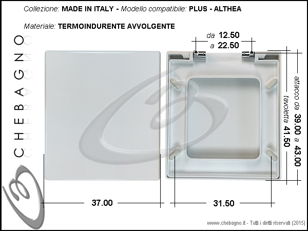 Copriwater PLUS ALTHEA. Sedile wc bianco in termoindurente avvolgente, chiusura libera o soft-close, cerniere in metallo. Copriwater compreso di cerniere e paracolpi.