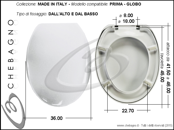 Dotazione copriwater: Coperchio avvolgente con copertura totale della ciambella in posizione di chiusura, kit di fissaggio in metallo regolabile, avvitabile dal basso e dall'alto (alta resistenza), paracolpi.