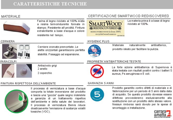 Materiale: Farina di legno e resina termoindurente. Copriwater prodotto in stampo. Certificato SmartWood Rediscovered, ossia utilizzo 100% legno riciclato e utilizzo di vernice a base d'acqua che consente una forte riduzione di VOC nell'ambiente.