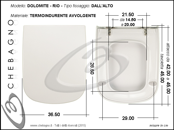 Copriwater RIO DOLOMITE. Sedile wc bianco in termoindurente avvolgente, chiusura libera o soft-close, cerniere in acciaio. Copriwater compreso di cerniere e paracolpi.
