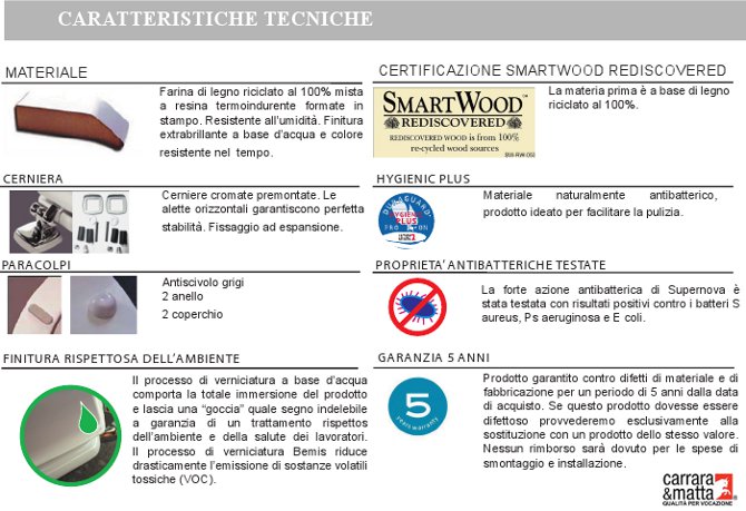 Materiale: Farina di legno e resina termoindurente. Copriwater prodotto in stampo. Certificato SmartWood Rediscovered, ossia utilizzo 100% legno riciclato e utilizzo di vernice a base d'acqua che consente una forte riduzione di VOC nell'ambiente.