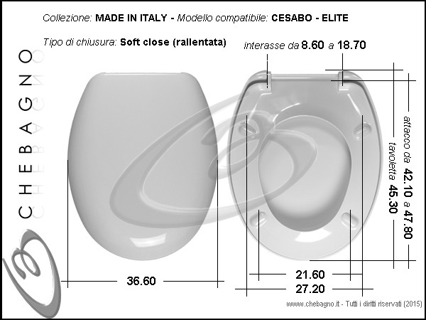 Elite Cesabo Sedile wc bianco in termoindurente avvolgente, chiusura rallentata (soft close), cerniere avvitabili dall'alto e dal basso. Copriwater compreso di cerniere e paracolpi.