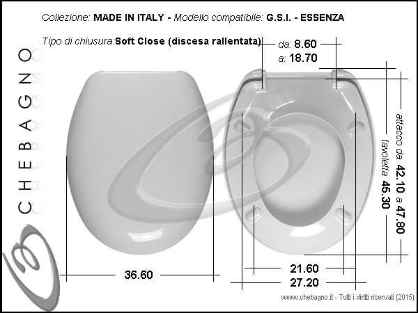 Essenza Gsi Sedile wc bianco in termoindurente avvolgente, chiusura rallentata (soft close), cerniere avvitabili dall'alto e dal basso. Copriwater compreso di cerniere e paracolpi.