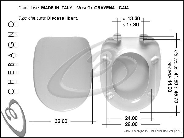Gaia Gravena Sedile wc bianco in termoindurente e cerniere avvitabile dal basso. Copriwater compreso di cerniere e paracolpi.