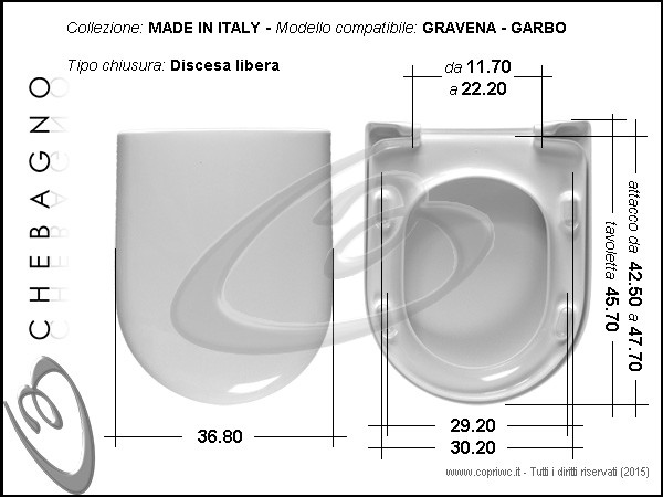 Garbo Gravena Sedile wc bianco in termoindurente avvolgente e cerniere avvitabile dall'alto e dal basso. Copriwater compreso di cerniere e paracolpi.