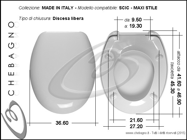 Maxi Stile Scic Sedile wc bianco in termoindurente avvolgente e cerniere avvitabile dall'alto e dal basso. Copriwater compreso di cerniere e paracolpi.