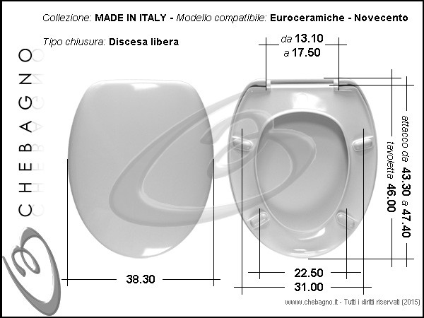 Dotazione copriwater: Coperchio avvolgente con copertura totale della ciambella in posizione di chiusura, kit di fissaggio in acciaio inox regolabile, avvitabile dal basso (alta resistenza), paracolpi.