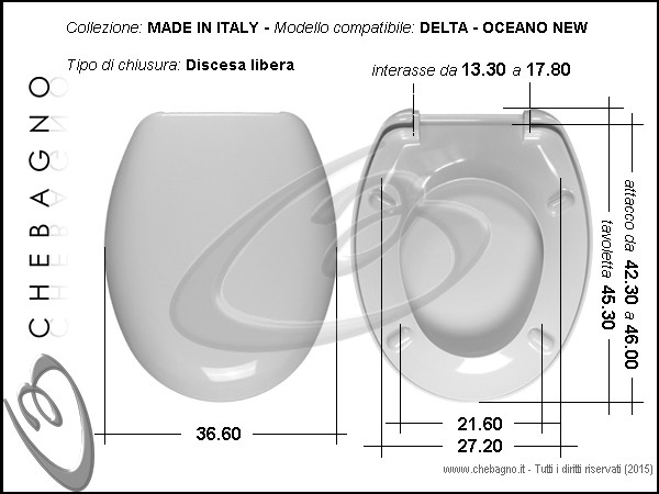 Oceano New DeltaSedile wc bianco in termoindurente avvolgente e cerniere avvitabile dal basso. Copriwater compreso di cerniere e paracolpi.