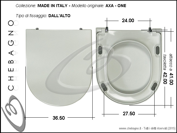 Dotazione copriwater: Coperchio avvolgente con copertura totale della ciambella in posizione di chiusura, kit di fissaggio in acciaio inox regolabile, avvitabile dall'alto e dal basso (alta resistenza), paracolpi.