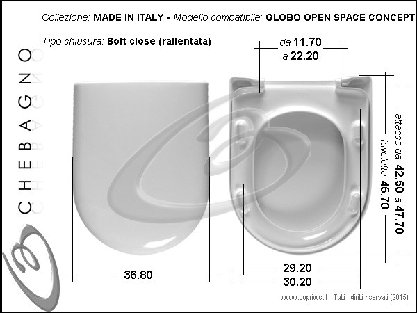 Open Space Concept Globo Sedile wc bianco in termoindurente avvolgente, chiusura rallentata (soft close), cerniere avvitabili dall'alto e dal basso. Copriwater compreso di cerniere e paracolpi.