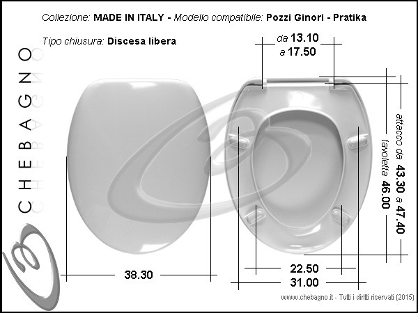 Pratika Pozzi Ginori Sedile wc bianco in termoindurente avvolgente e cerniere in acciaio inox cromo lucido regolabili. Copriwater compreso di cerniere e paracolpi.