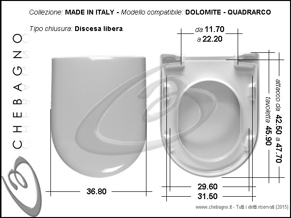 Quadrarco Dolomite Sedile wc bianco in termoindurente avvolgente e cerniere in acciaio inox cromo lucido regolabili dall'alto. Copriwater compreso di cerniere e paracolpi.