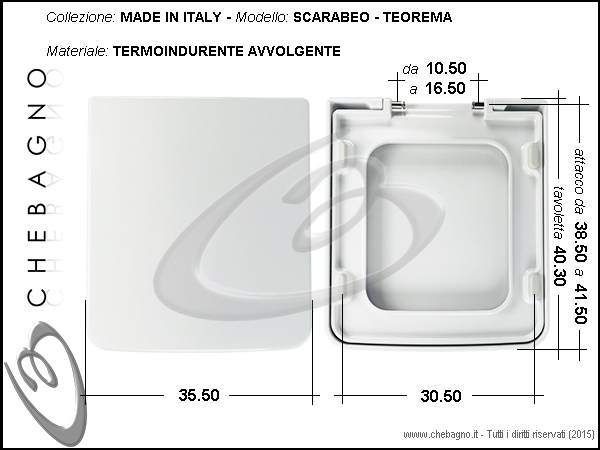 Copriwater SCARABEO TEOREMA. Sedile wc SOFT CLOSE (chiusura rallentata) bianco in termoindurente avvolgente, cerniere in metallo. Copriwater compreso di cerniere e paracolpi.