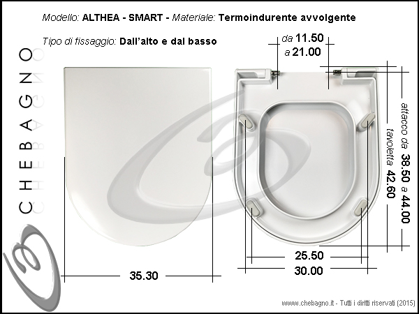 Copriwater ALTHEA SMART. Sedile wc bianco in termoindurente avvolgente, chiusura libera, cerniere in metallo. Copriwater compreso di cerniere e paracolpi.