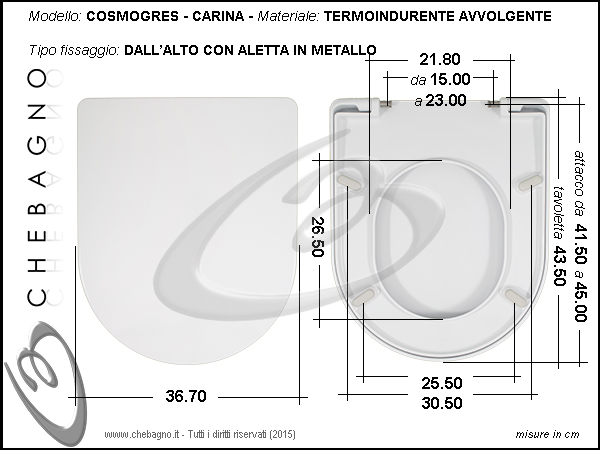 Dotazione copriwater: Coperchio avvolgente con copertura totale della ciambella in posizione di chiusura, kit di fissaggio in metallo regolabile, avvitabile dal basso e dall'alto (alta resistenza), paracolpi.