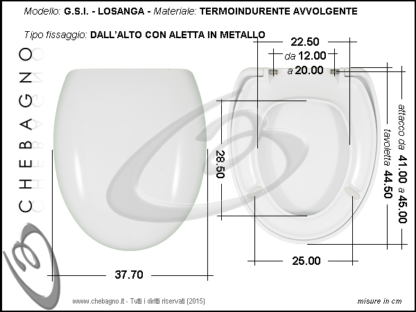 Dotazione copriwater: Coperchio avvolgente con copertura totale della ciambella in posizione di chiusura, kit di fissaggio in metallo regolabile, avvitabile dal basso e dall'alto (alta resistenza), paracolpi.