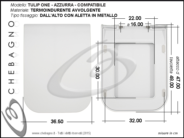 Copriwater compatibile Tulip Azzurra. Sedile wc SOFT CLOSE (chiusura rallentata) bianco in termoindurente avvolgente, cerniere in metallo. Copriwater compreso di cerniere e paracolpi.