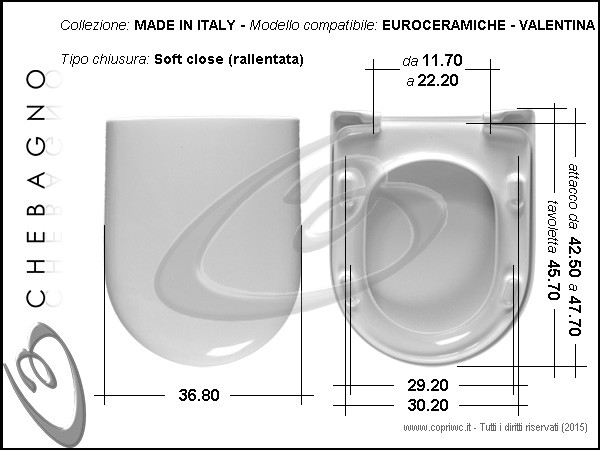 Valentina Euroceramiche Sedile wc bianco in termoindurente avvolgente, chiusura rallentata (soft close), cerniere avvitabili dall'alto e dal basso. Copriwater compreso di cerniere e paracolpi.