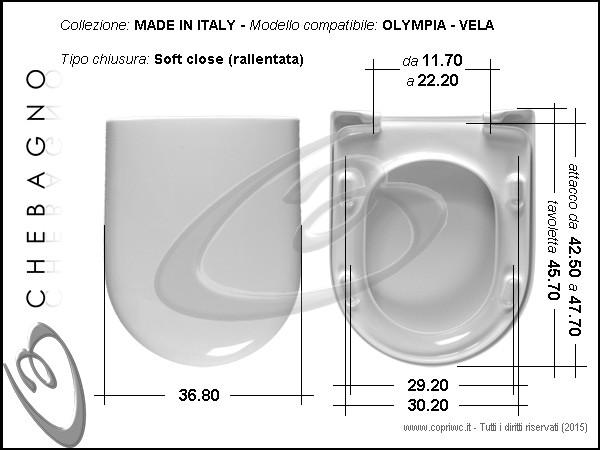 Vela Olympia Sedile wc bianco in termoindurente avvolgente, chiusura rallentata (soft close), cerniere avvitabili dall'alto e dal basso. Copriwater compreso di cerniere e paracolpi.