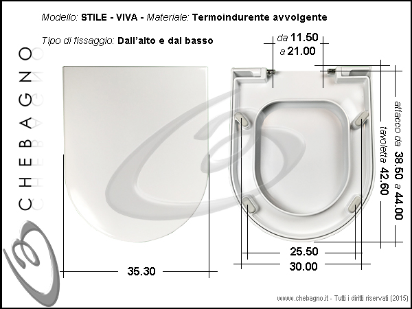 Dotazione copriwater: Coperchio avvolgente con copertura totale della ciambella in posizione di chiusura, kit di fissaggio in metallo regolabile, avvitabile dal basso e dall'alto (alta resistenza), paracolpi.